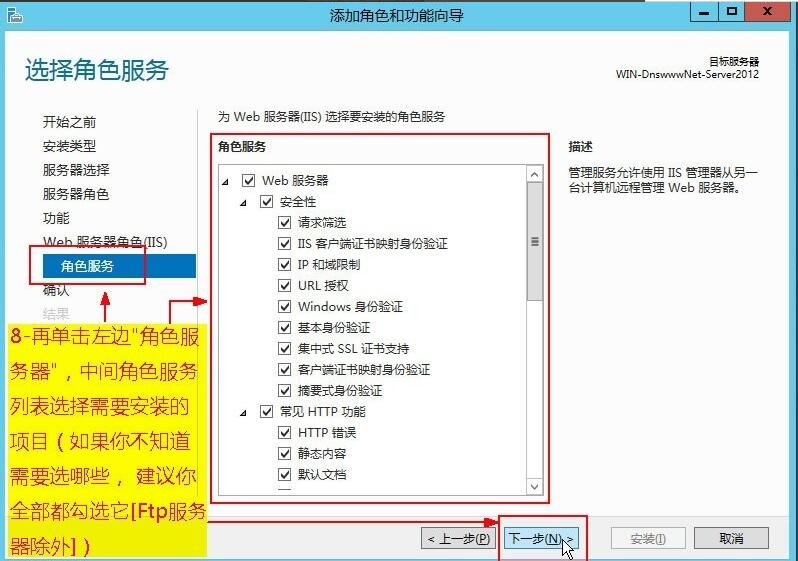 上面圖中顯示的是我已經(jīng)安裝過了web服務(wù)器IIS,如果是你,要在web服務(wù)器(IIS)這里需要勾選下,然后出來下面界面,再按以下界面一步步操作: