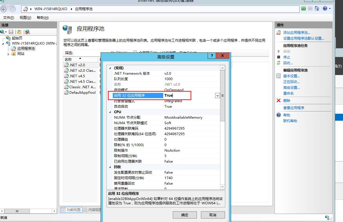 把上面默認(rèn)的:啟用32位應(yīng)用程序:False改為True,這個(gè)非常重要哦,然后確定后就大功告成了,這時(shí)在服務(wù)器上用瀏覽器輸入localhost