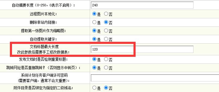 首先:進(jìn)入后臺 -> 系統(tǒng) -> 系統(tǒng)基本參數(shù)->其它選項(xiàng) -> 文檔標(biāo)題最大長度把次參數(shù)修改為需要設(shè)置的標(biāo)題最大長度,默認(rèn)參數(shù)是60,一般我們修改成120(根據(jù)需要填寫數(shù)值)。如下圖: