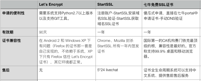 有效期: StartSSL和七牛都是一年,Let’s Encrypt 90天。