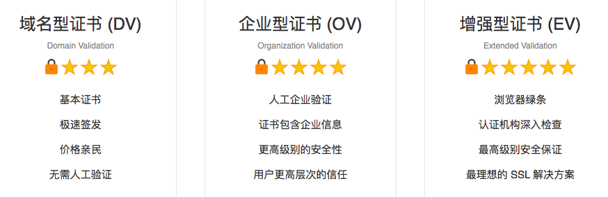 通常來說,SSL 證書分為三大類,他們的安全性是遞增的,當(dāng)然價(jià)格和安全系數(shù)成正比。