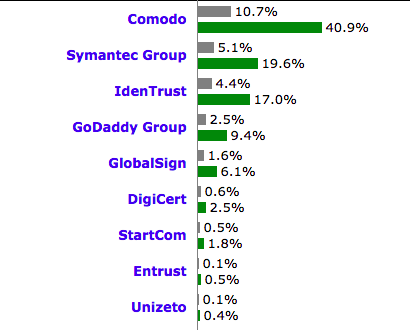 下圖是 w3techs.com 16 年 2 月發(fā)布的 SSL 證書市場份額報(bào)告中的部分截圖。