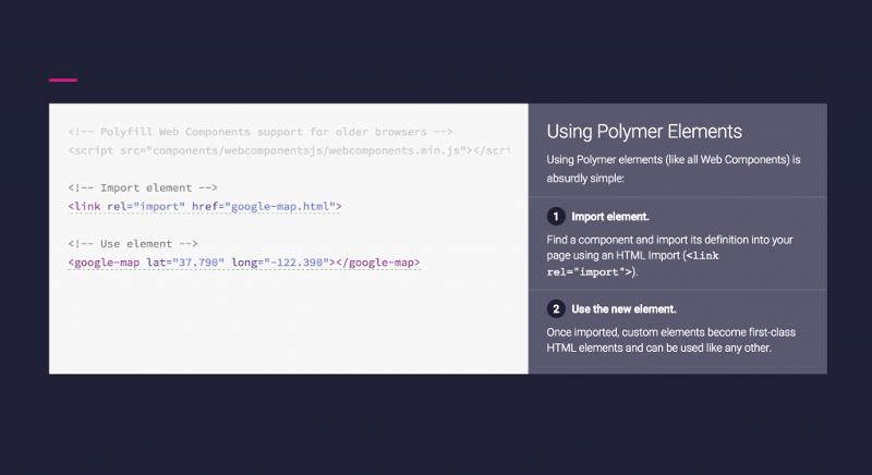 谷歌材料設(shè)計(jì)打響了第一炮,它在所有新式瀏覽器的支持下,提供了來自于Android app的多種多樣的動畫和互動組件,以及像這樣的簡單標(biāo)簽: